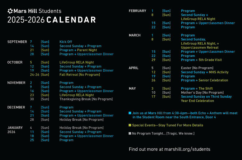 Mars Hill Students is a community for 6th-12th grade students to explore who God has made them to be and their role in God's grand story. It is a place for students to journey together as they seek to be a Jesus people for the sake of the world— asking big questions, hearing and telling stories of God's ongoing involvement in our world, and engaging in practices to model the way of Jesus in our lives.